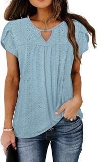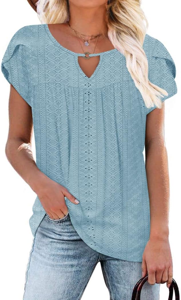 - Feature: Classic crew neck,cute key hole at the neck,fashion hollow out design, lovely petal sleeves, front pleated loose casual tunics that so flattering to hide the belly better