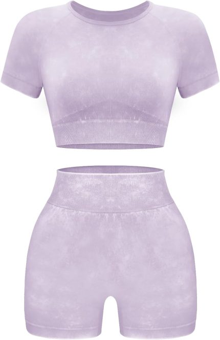 Women’s Workout Sets 2 Piece – Seamless Acid Wash Yoga Outfits Shorts and Crop Top Matching Gym Athletic Clothing Set